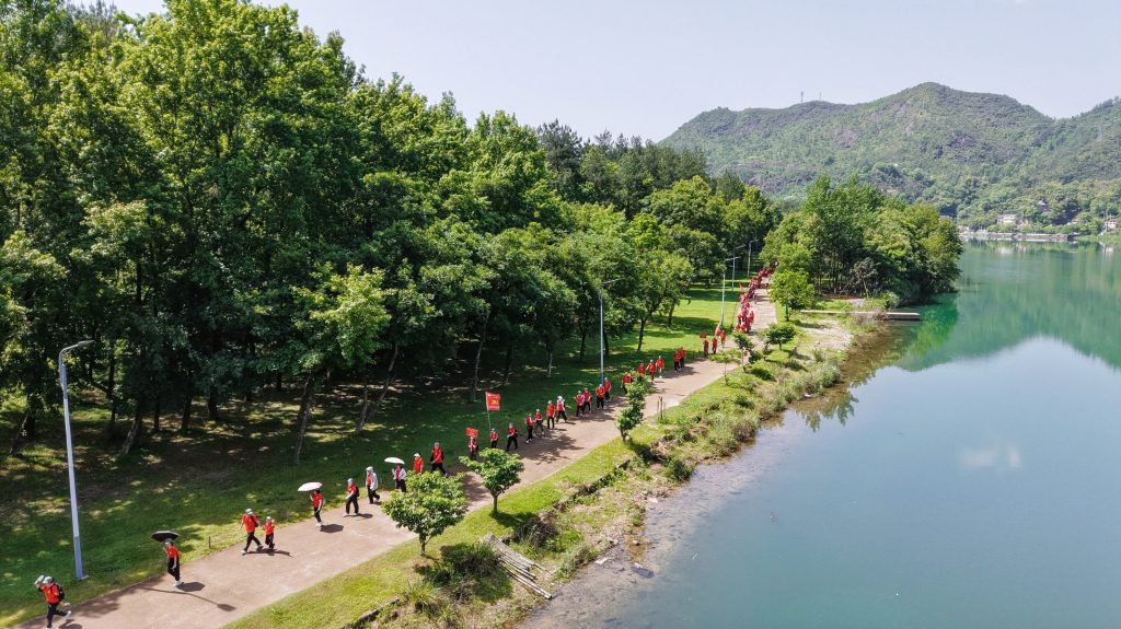 9?點(diǎn)?10?分,100?支團(tuán)隊(duì)、2000?余人組成的隊(duì)伍整齊排列,高舉旗幟,正式出發(fā)。全程約?12?公里的路線,途經(jīng)高浦漁村、永嘉烈士陵園、漁田村、太平嶺、古廟口村等?14?處,每一處都承載著厚重的歷史記憶。烈日當(dāng)空,室外最高氣溫突破?30℃,但這絲毫沒有動(dòng)搖報(bào)喜鳥黨員們前行的決心。在行進(jìn)過程中,大家精神飽滿,相互扶持,用堅(jiān)定的步伐丈量信仰的高度,通過分享革命故事汲取奮進(jìn)的力量。當(dāng)熟悉的紅色旋律《團(tuán)結(jié)就是力量》《沒有共產(chǎn)黨就沒有新中國》《打靶歸來》在綠水青山間響起,每一位黨員都心潮澎湃,歌聲中飽含著對黨的忠誠與熱愛。